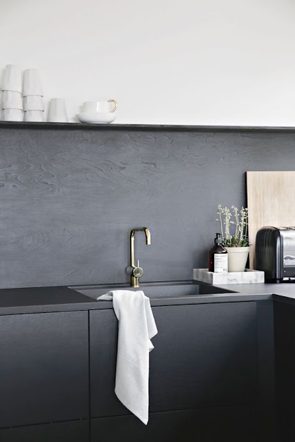 I love the black painted plywood backsplash with the brass faucet.