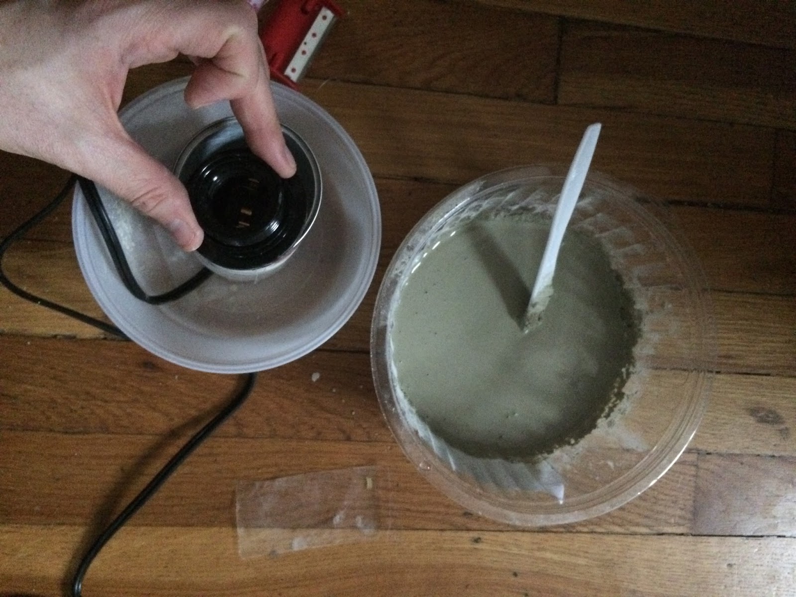 I put the whole thing into a larger container for any concrete that got out. Now, the directions to the concrete package said something vague like "add water" and that adding more water meant "less firm concrete". The first batch of concrete I mixed was "soupy" (seen below), and that worked fine, when I needed more concrete for my mold, I made it thicker and that worked fine as well.....so don't stress about the consistency too much. Now the concrete will set fast, so you will need to work quickly, but you do have a minute or so to maneuver things and get them just the way you want. I held the light fixture while Connor poured the concrete in the cracks, and then with my finger I made sure it was level.