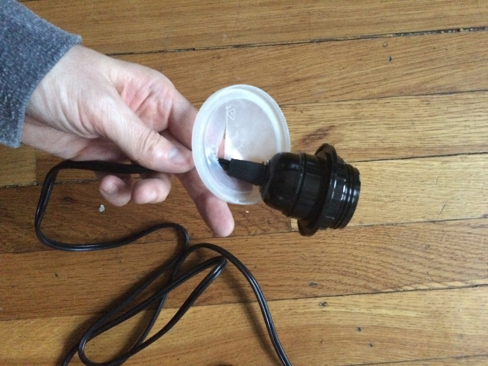Next, I cut a hole in the lid of my container and fed the light kit cord through the hole. I used the lid on the bottom of the container, and taped around the hole the cord came through so that no concrete would come through when I poured it.