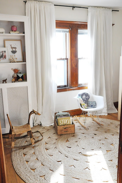 The curtains. The designer in me is annoyed that they are at the wrong length (higher please!), but the renter in me is trying not to poke holes in these walls unnecessarily, and the windows already had the hardware built in when we moved into the house. I'm trying to respect that- we will see how long that lasts.