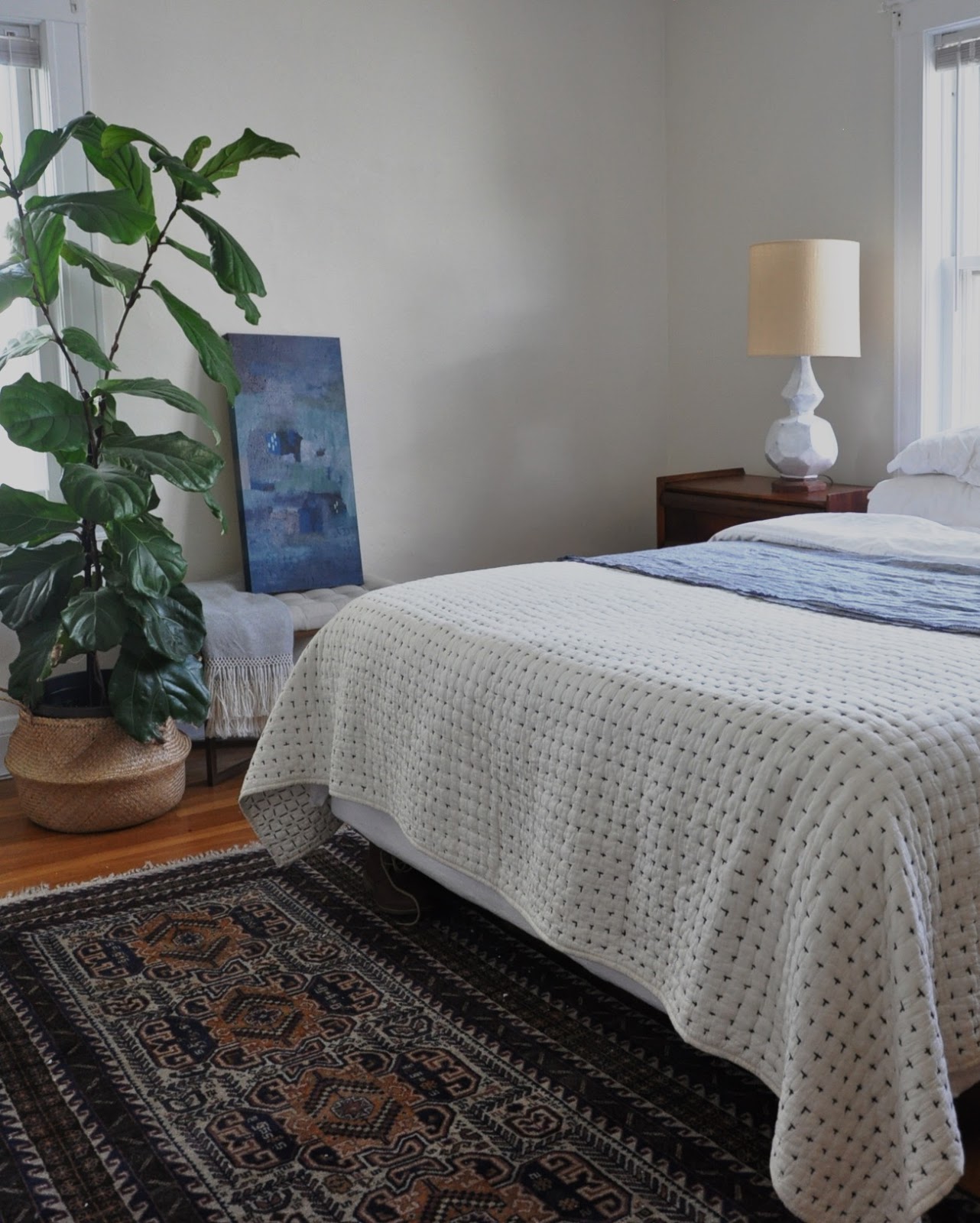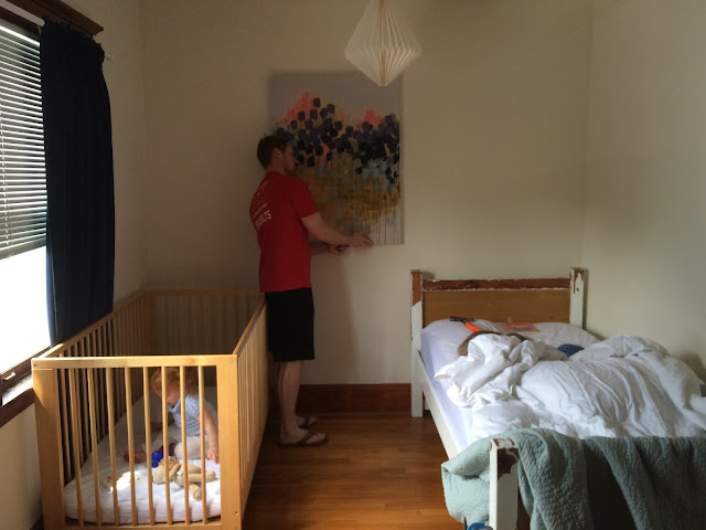 My Fiddle Leaf has gotten huge! So much that when we moved to Boston we couldn't fit it in our car and had to leave it with my parents. My in-laws recently brought it up,(in their prius no less!), and it makes our bedroom come to life. This painting- I don't think I'm finished with it yet, so that's on the list.