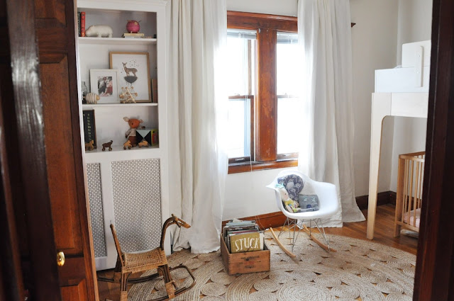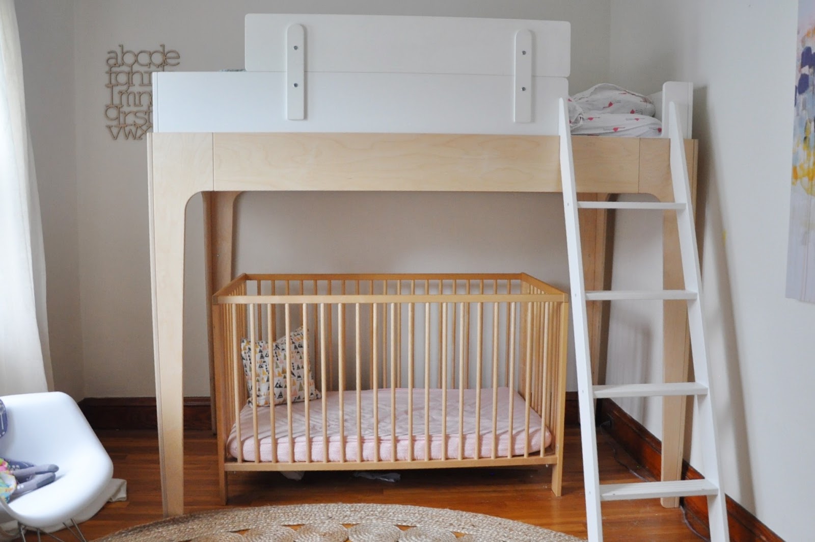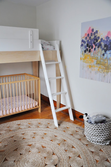 We have moved more furniture around in the girl's room than we have ever moved furniture around in our life. Part of the problem is that the room is small, and both the radiator and windows take up some of the wall space. The other part of the problem is that we were originally trying to fit Reese's twin bed and Charlie's crib in the room ( we knew fitting a dresser in the room was out of the question). These are obviously essentials, but tricky in a small space. I googled "shared toddler/baby rooms" a lot and could only find a few photos. We tried all sort of configurations (parallel, perpendicular...you name it) and nothing seemed to work. I didn't want the crib by the window because of the blinds/curtains, and with the twin by the window Reese seemed to stay up all hours of the night just looking out the window. We finally resorted to putting the crib in the middle of the room at night and moving it back against the wall in the day. Not ideal. In all honesty I sort of gave up on the room.....UNTIL I found this Oeuf loft bed on craigslist for a deal. It single-handedly transformed the space.